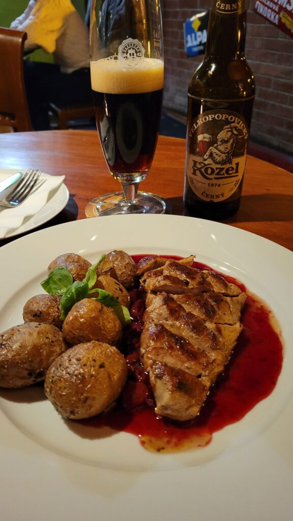 I got into town around 6ish last night, found the hotel, figured out the contactless check in, pulled every push door, and pushed every pull door (I still haven’t figured out the pattern and there’s pull handles on every side). By the time I got settled in I had about enough left in me to get dinner and pass out. Dinner was good though, pork in a cherry sauce with potatoes and a sprig of steamed leaves. The restaurant I ate at advertises live piano Wed-Fri nights but I did not see a piano anywhere in it.